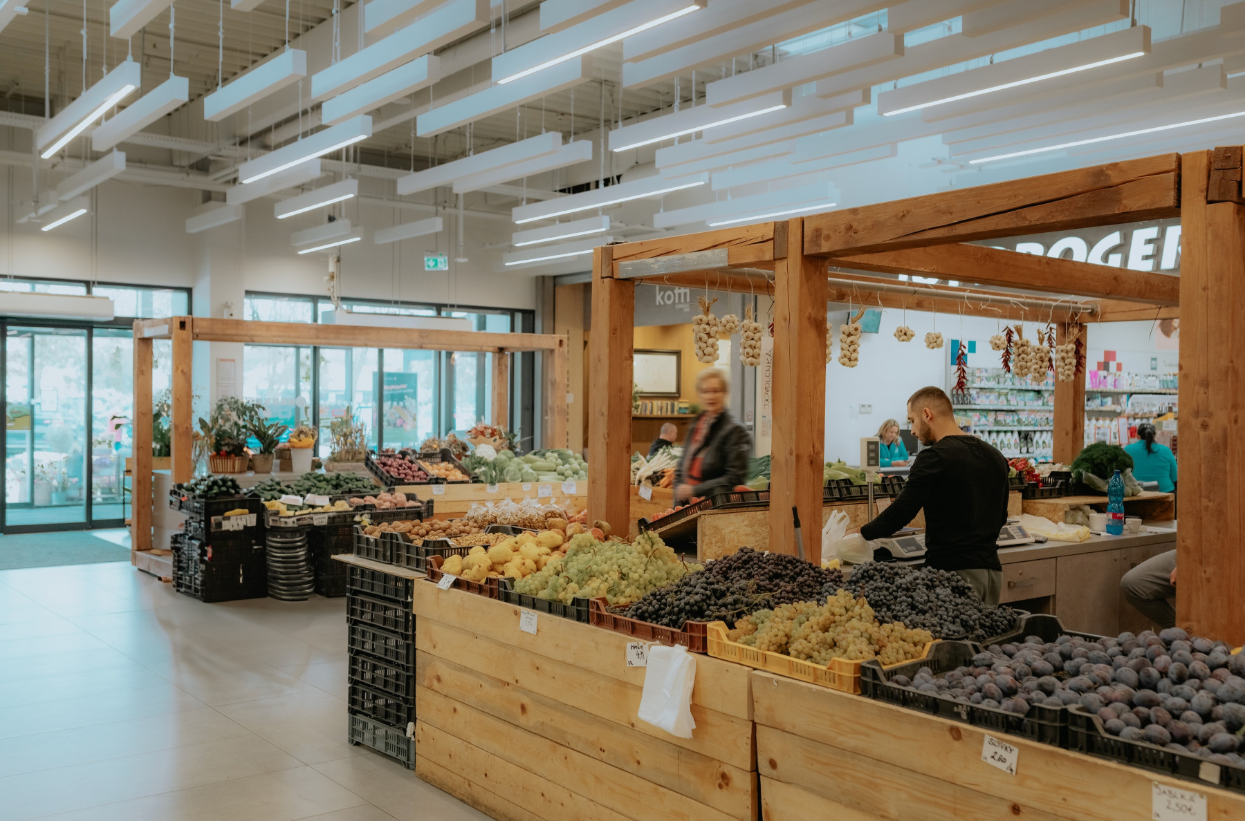 Na prízemí našej tržnice vybavíte pohodlne a rýchlo svoje pravidelné nákupy. Sedem dní v týždni sú otvorené moderné slovenské potraviny KRAJ, ktoré okrem bežných potravín ponúkajú aj výrobky regionálnych dodávateľov, či výber zdravého sortimentu pre vegánov, výrobky bez lepku a laktózy. Milovníci zahraničnej kuchyne si prídu na svoje v talianskom rodinnom obchode Mamma Mia, v balkánskych potravinách Balkan Market alebo si môžu pochutnať na špecialitách z ázijského, ukrajinského alebo balkánskeho bistra.